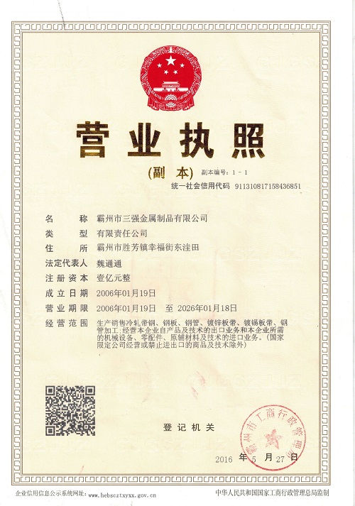 河北霸州市三強(qiáng)金屬制品有限公司坐落于歷史文化名鎮(zhèn)-------勝芳鎮(zhèn),是一家集中寬帶光亮帶鋼、熱鍍鋅帶鋼、精密制管、優(yōu)質(zhì)鋼等產(chǎn)品開(kāi)發(fā)、生產(chǎn)、銷(xiāo)售于一體的鋼鐵聯(lián)合企業(yè)。公司創(chuàng)建于2006年,占地面積142300平方米,注冊(cè)資金1億元,現(xiàn)有員工600多人,年產(chǎn)1000mm以下冷軋薄帶100萬(wàn)噸。產(chǎn)品廣泛應(yīng)用于汽車(chē)、家電、建筑、橋梁、電子等行業(yè)。產(chǎn)品規(guī)格全、質(zhì)量好、售后有保障。是廣大終端用戶(hù)、鋼貿(mào)商理想的可持續(xù)合作伙伴。